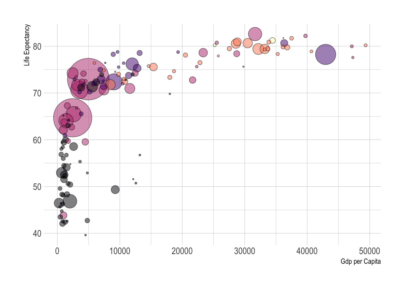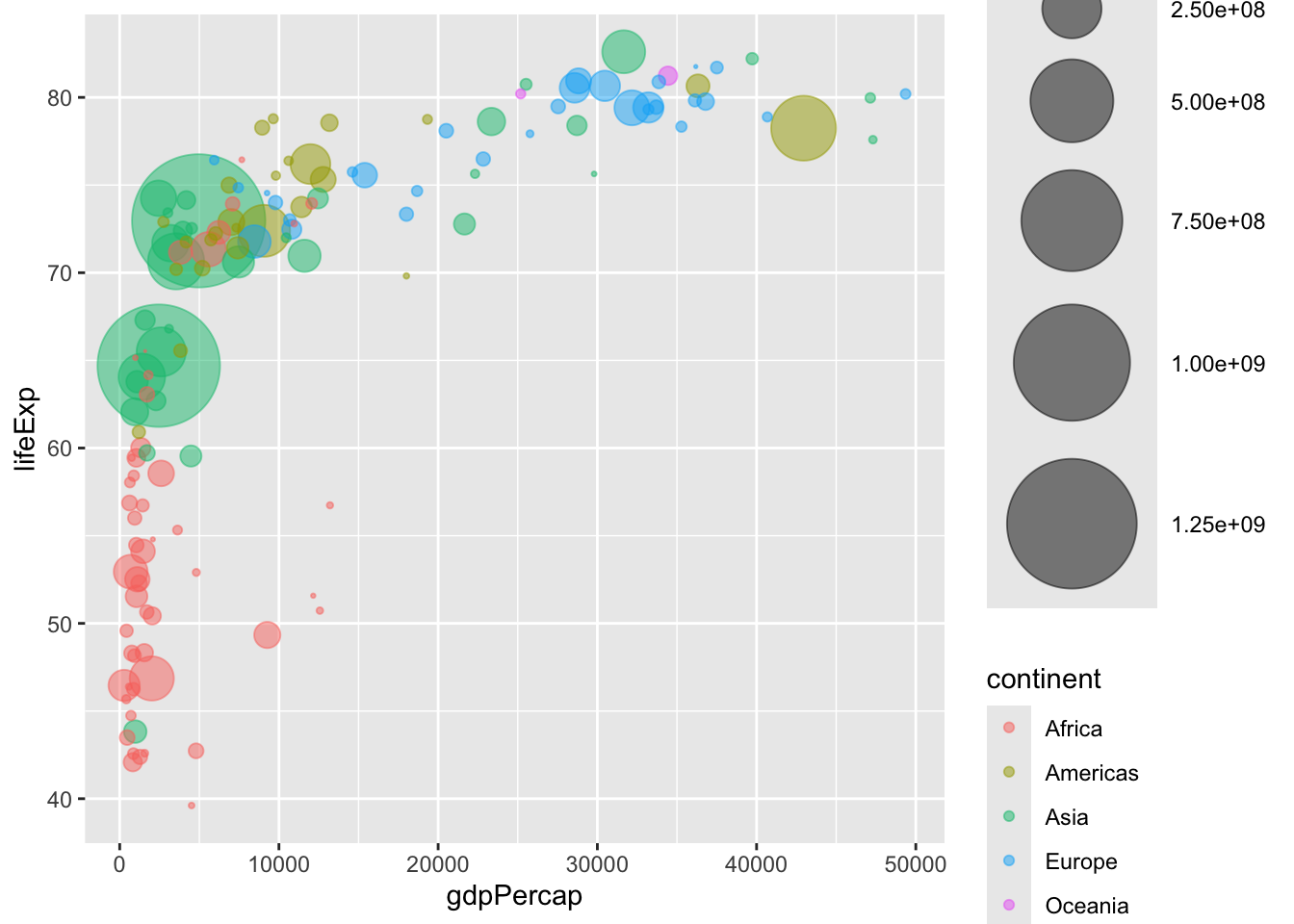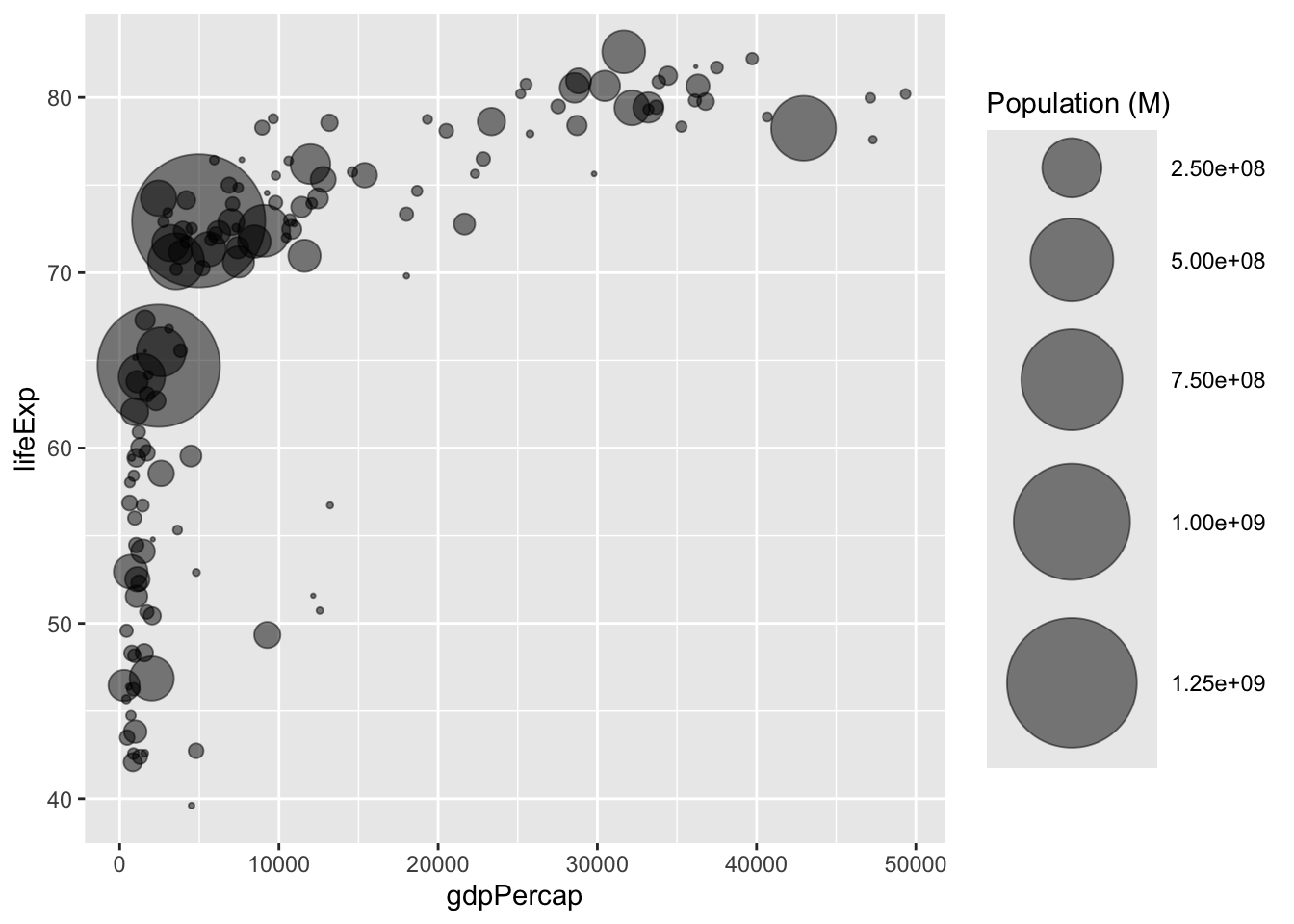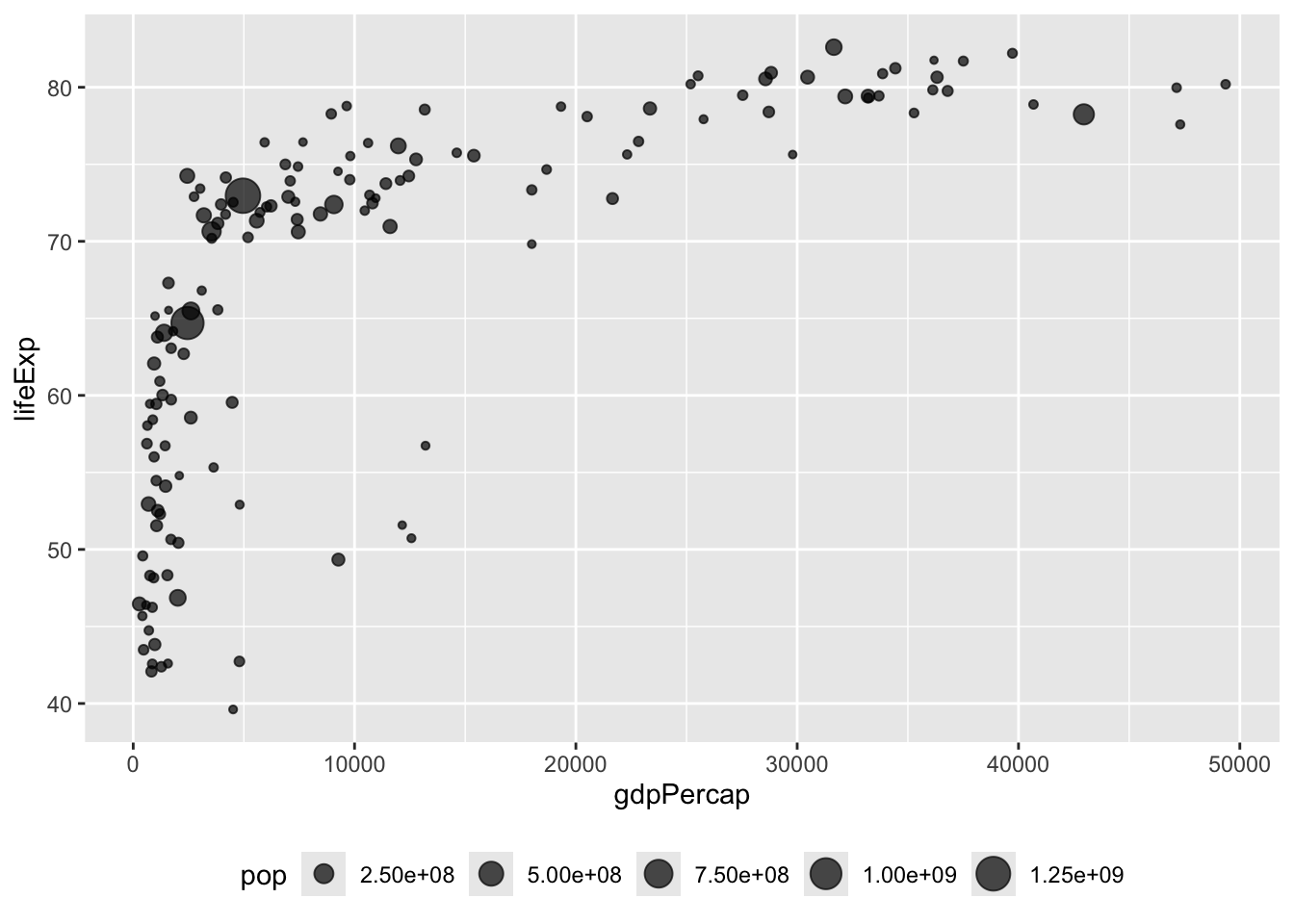 ggplot(data, aes(x = gdpPercap, y = lifeExp, size = pop)) +