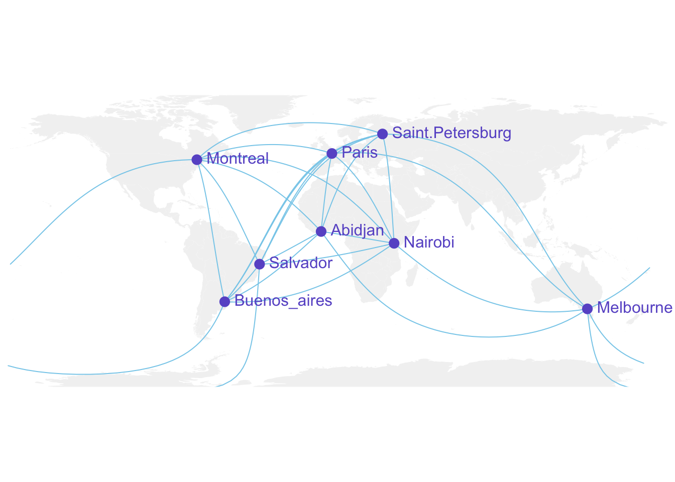 现在我们可以通过绘制城市间的最短路线来连接城市。这是使用大圆弧完成的,比使用直线提供更好的可视化效果。