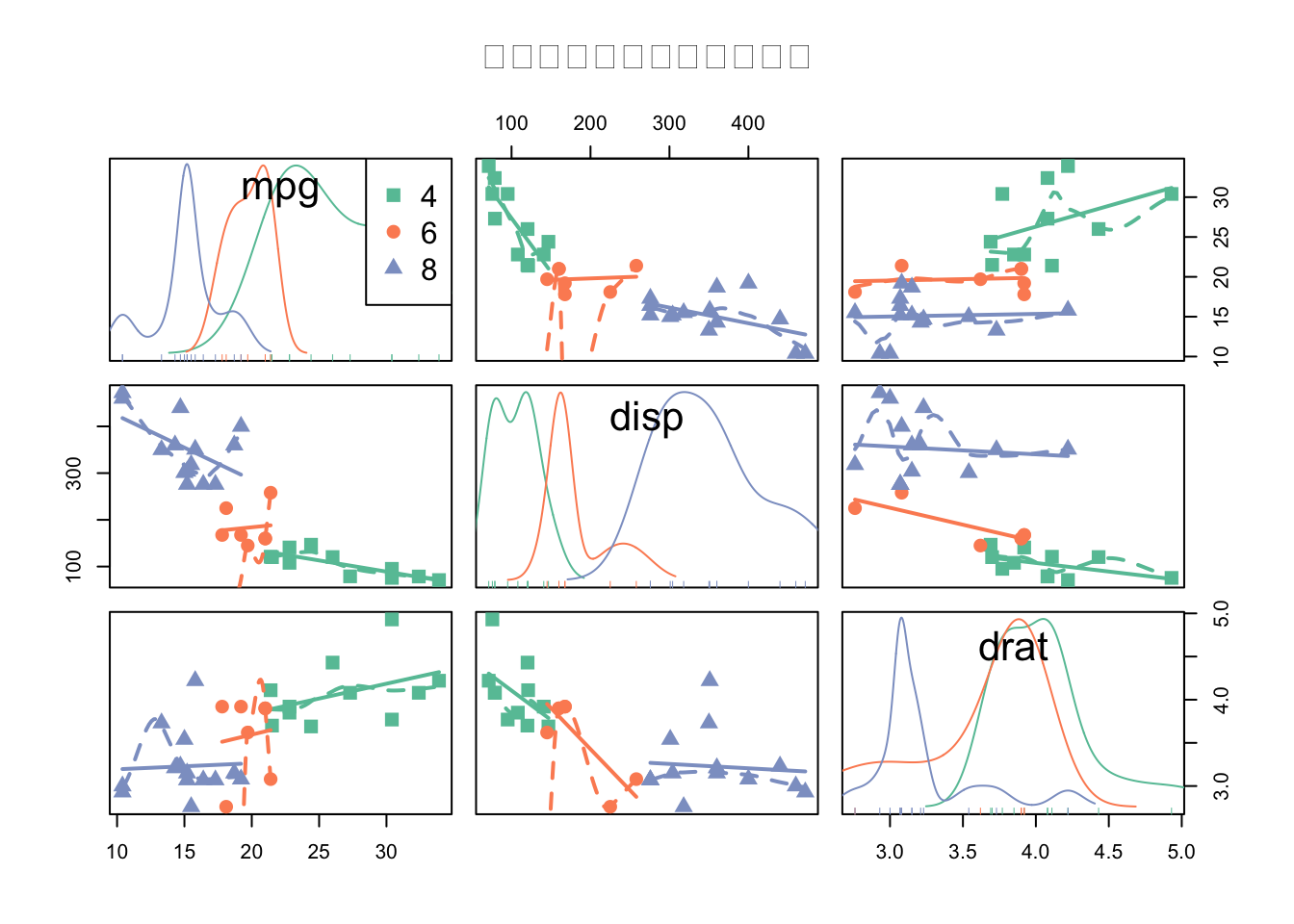 main = "按气缸数分组的散点图矩阵" # 图标题