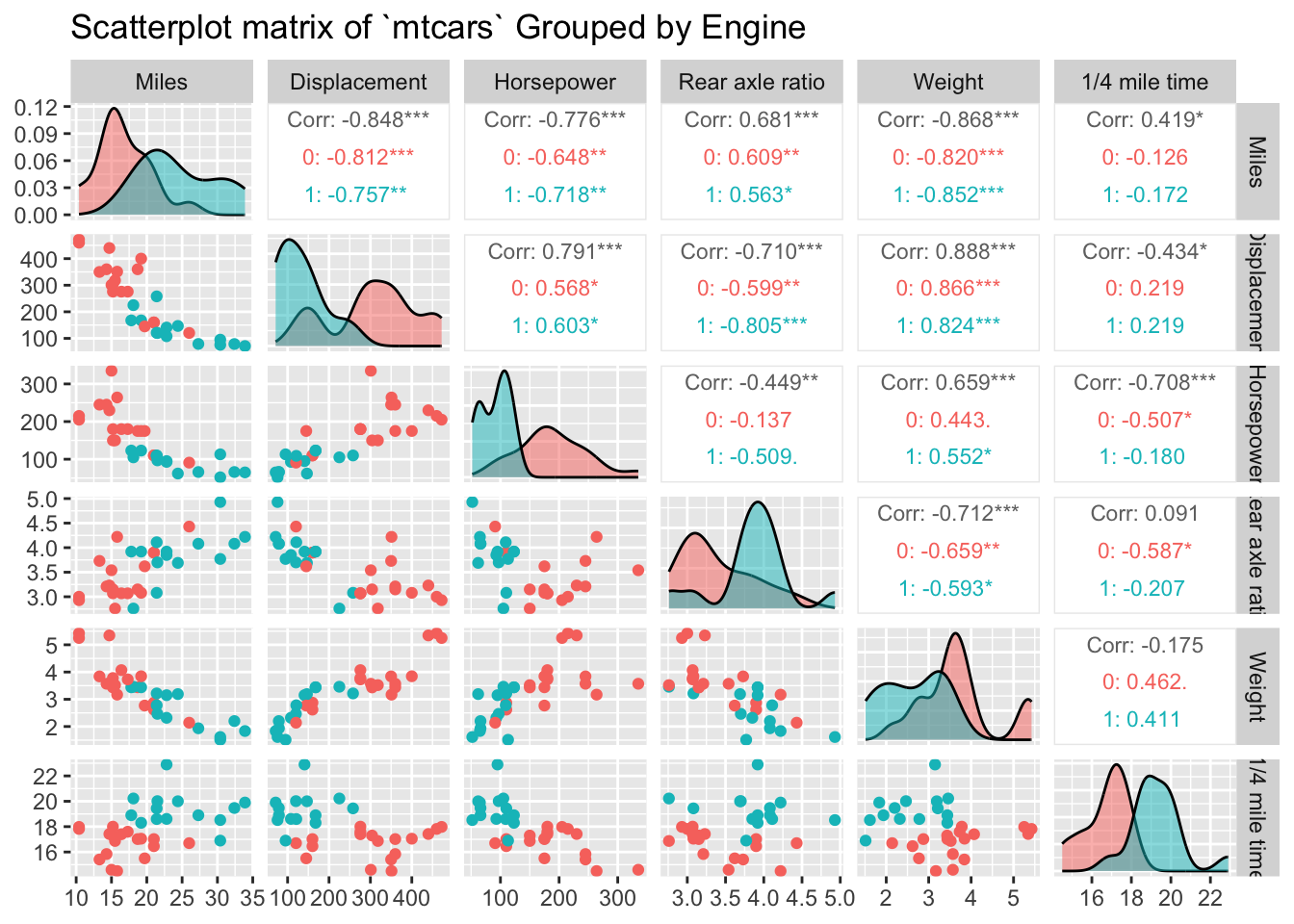 title = "Scatterplot matrix of `mtcars` Grouped by Engine"
