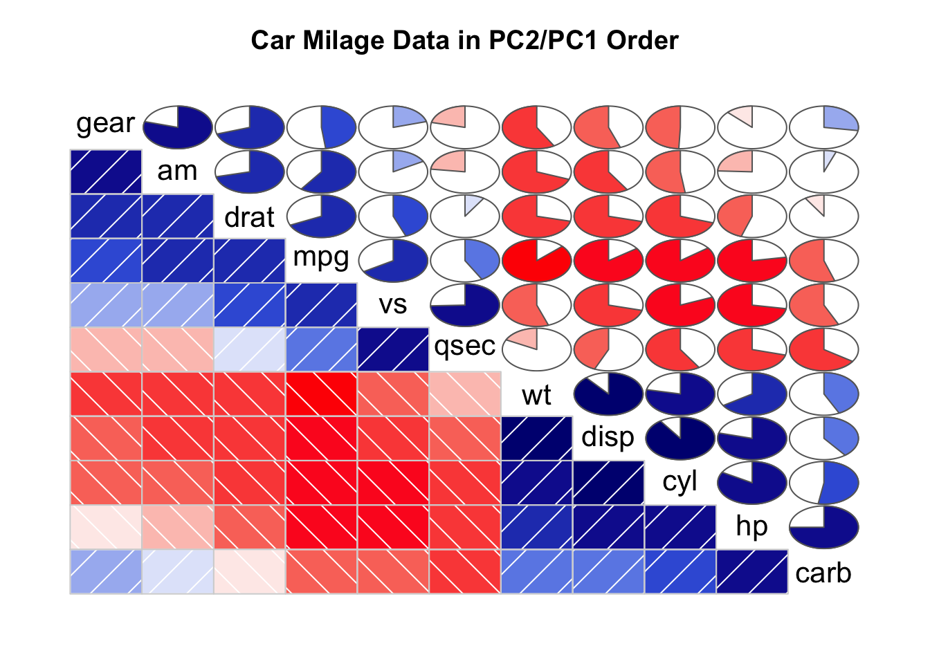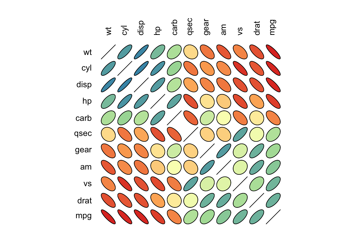 corrgram()# 第一种:下三角为色块,上三角为饼图,主对角线为变量名