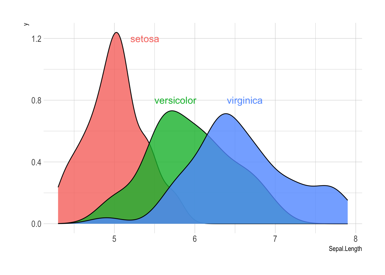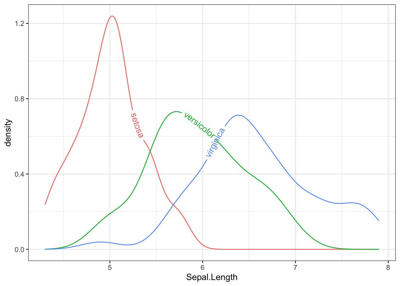 ggplot(iris, aes(x = Sepal.Length, color = Species, label = Species)) +