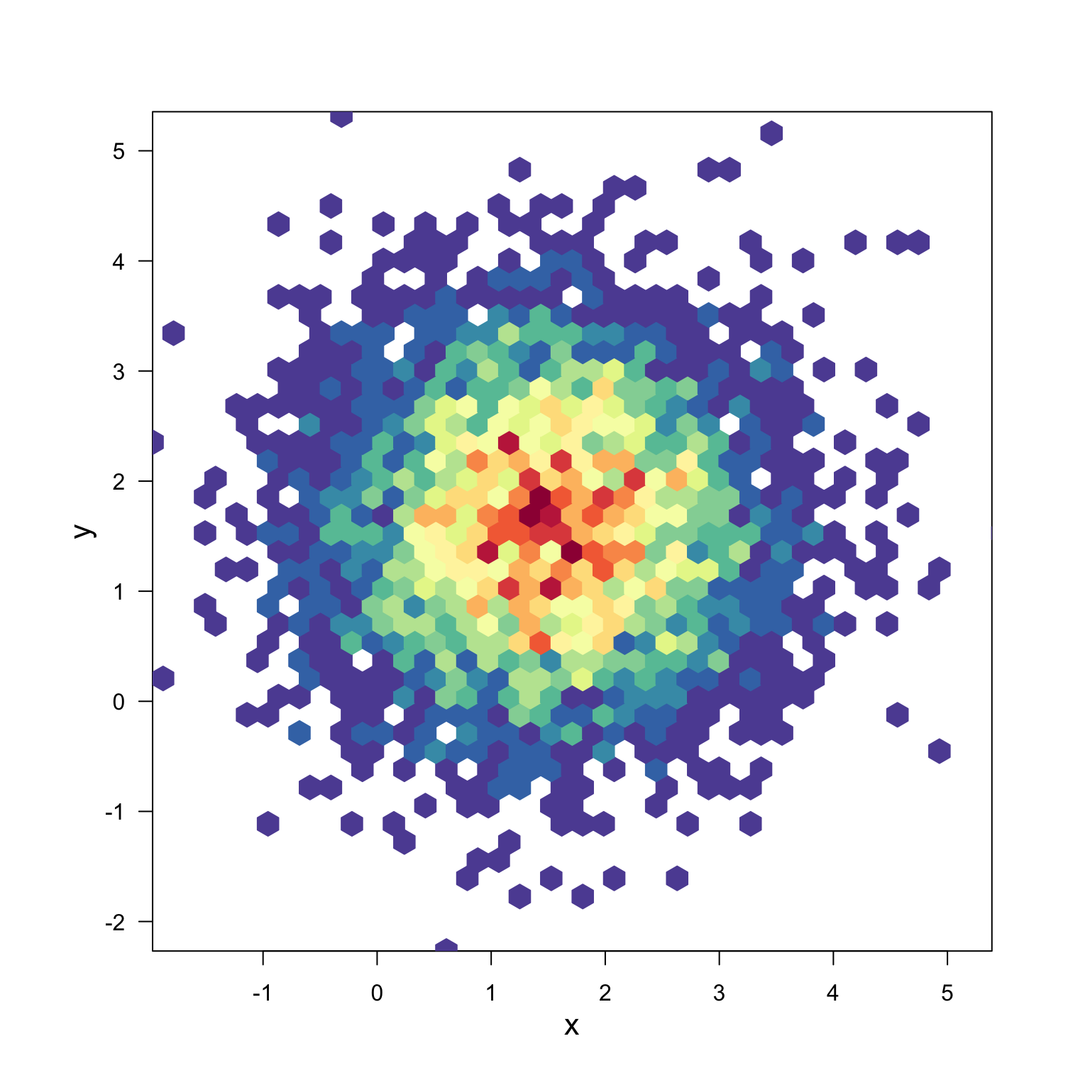 bin <- hexbin(x, y, xbins = 40)