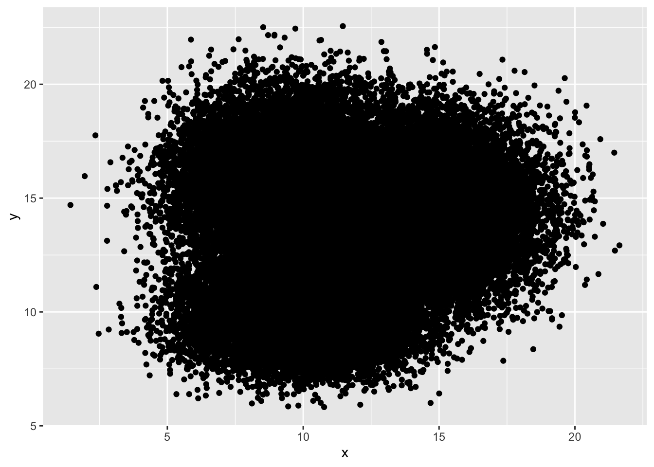 a <- data.frame(x = rnorm(20000, 10, 1.9), y = rnorm(20000, 10, 1.2)) # 第一组,均值为10
