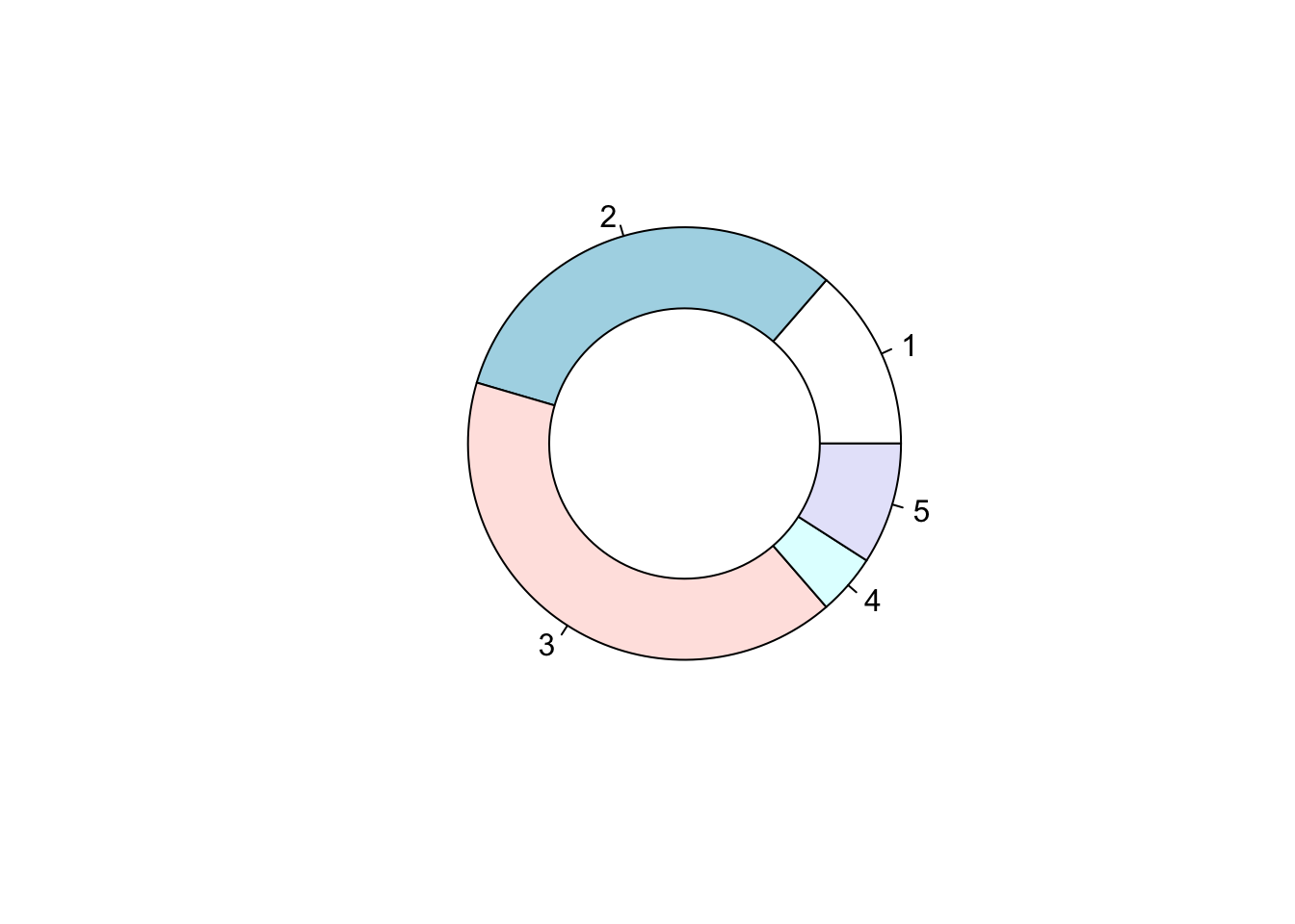 library(tidyverse)Base R先用 pie() 绘制一个饼图,再用Base R::symbols() 叠加略小白色圆形来形成环形效果。