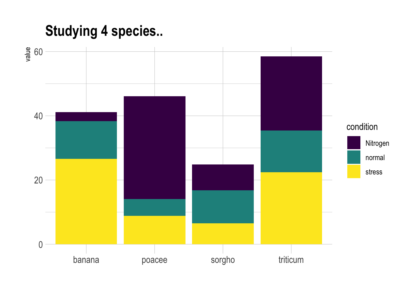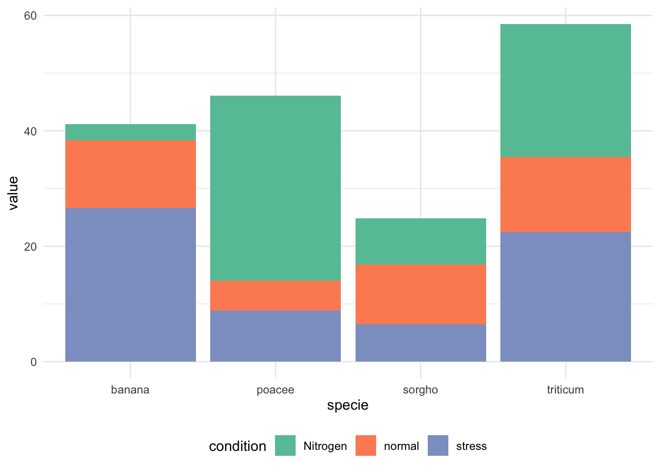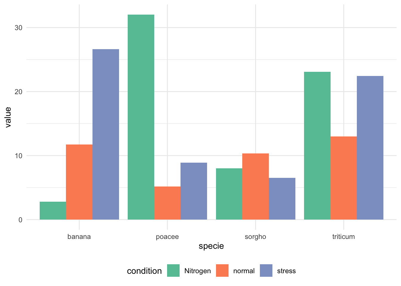 ggplot(data, aes(fill = condition, y = value, x = specie)) +