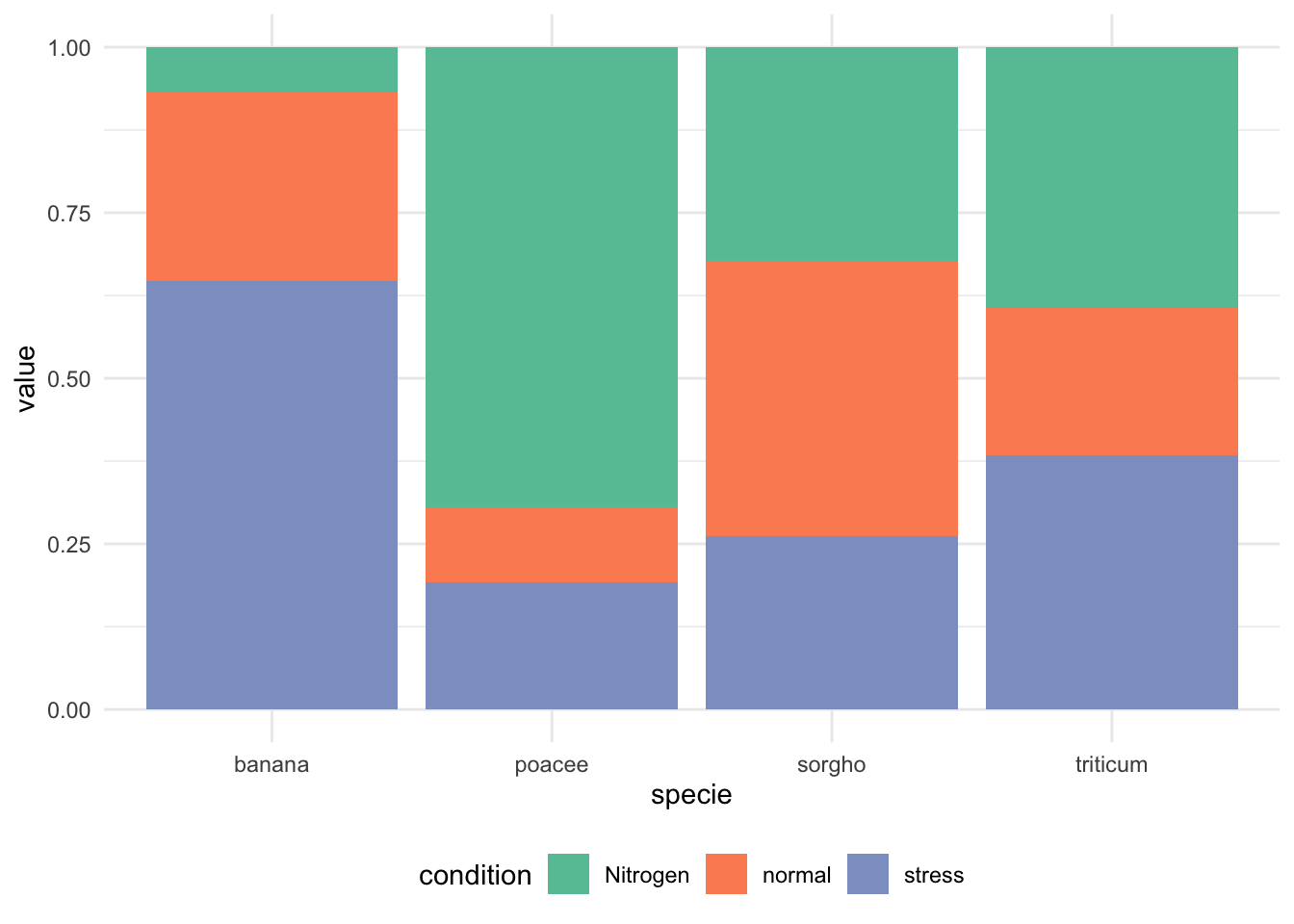 # condition:实验条件,共3种(normal、stress、Nitrogen),每种物种下各有3个条件