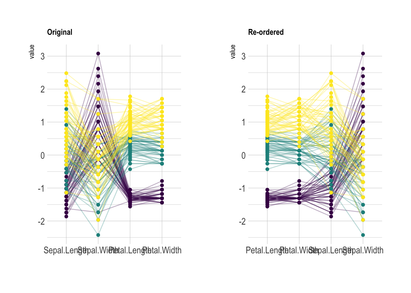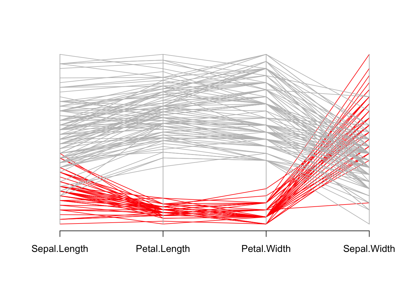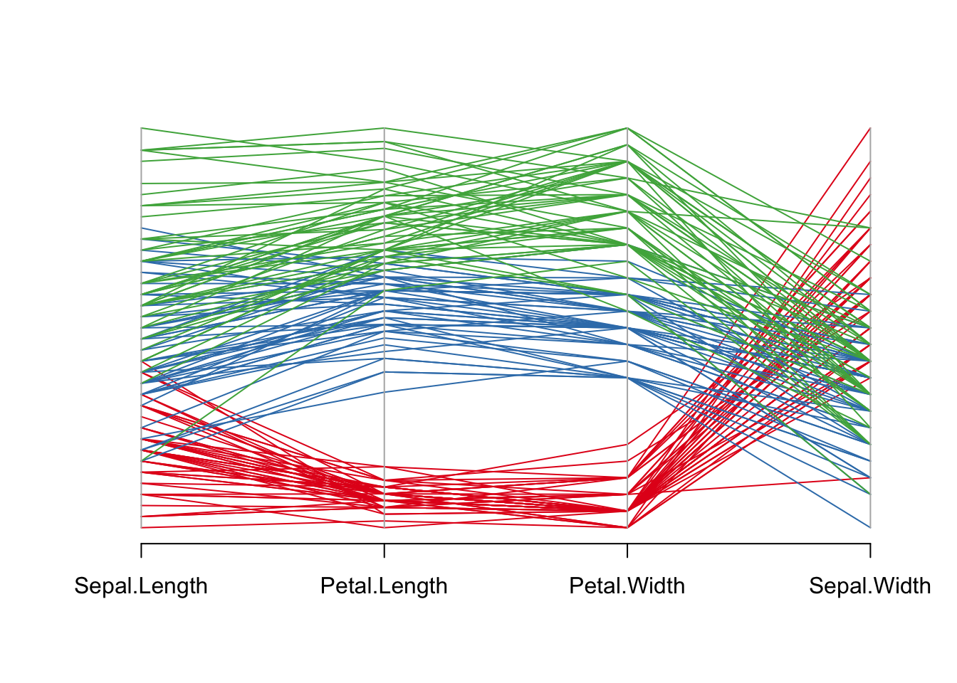 iris[, c(1, 3, 4, 2)], # 选择变量顺序(花萼长度、花瓣长度、花瓣宽度、花萼宽度)