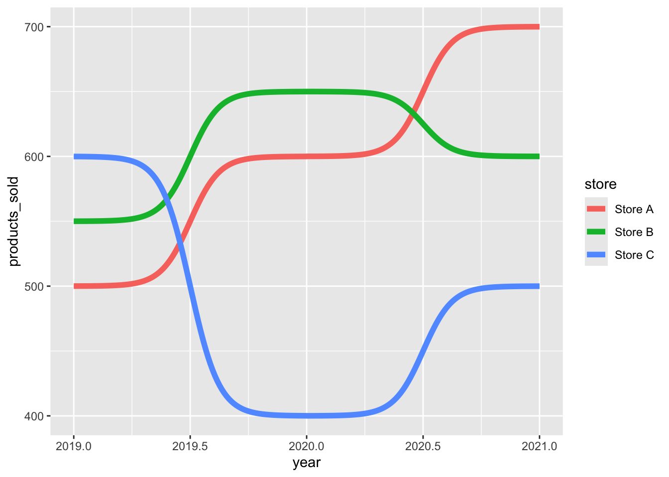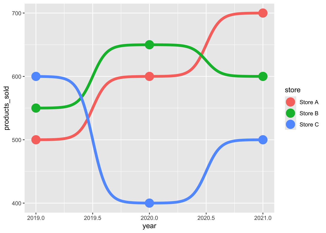 ggplot(df, aes(x = year, y = products_sold, color = store)) +