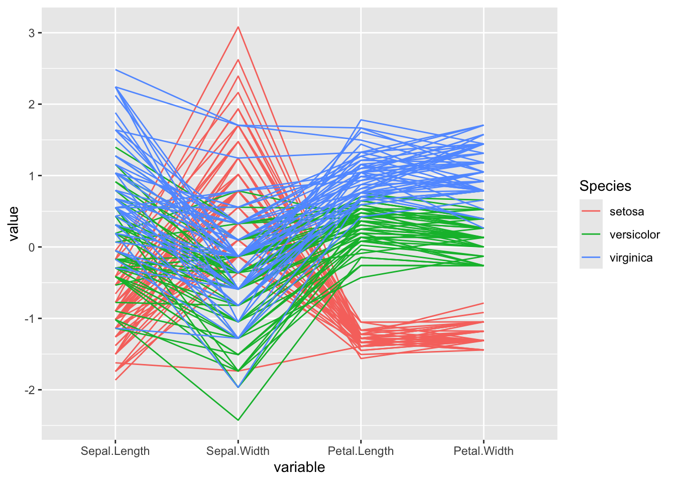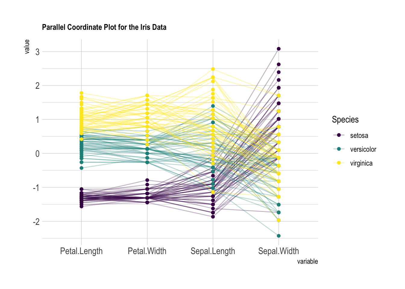 title = "Parallel Coordinate Plot for the Iris Data", # 图标题