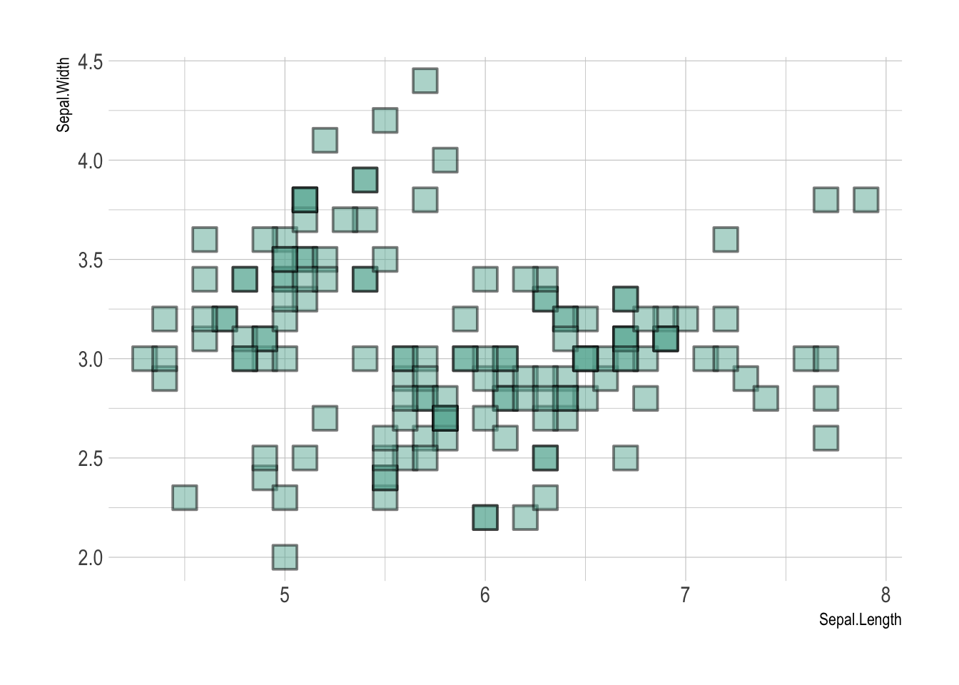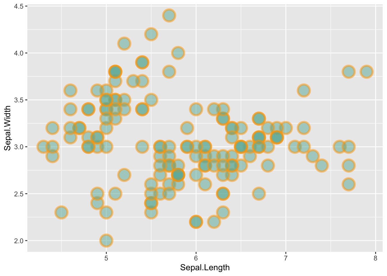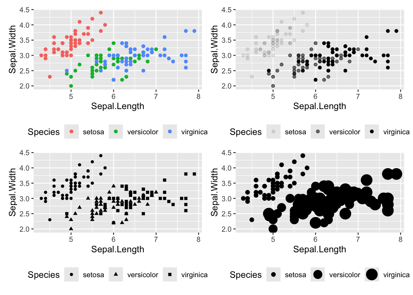 p_alpha <- ggplot(iris, aes(x=Sepal.Length, y=Sepal.Width, alpha=Species)) +