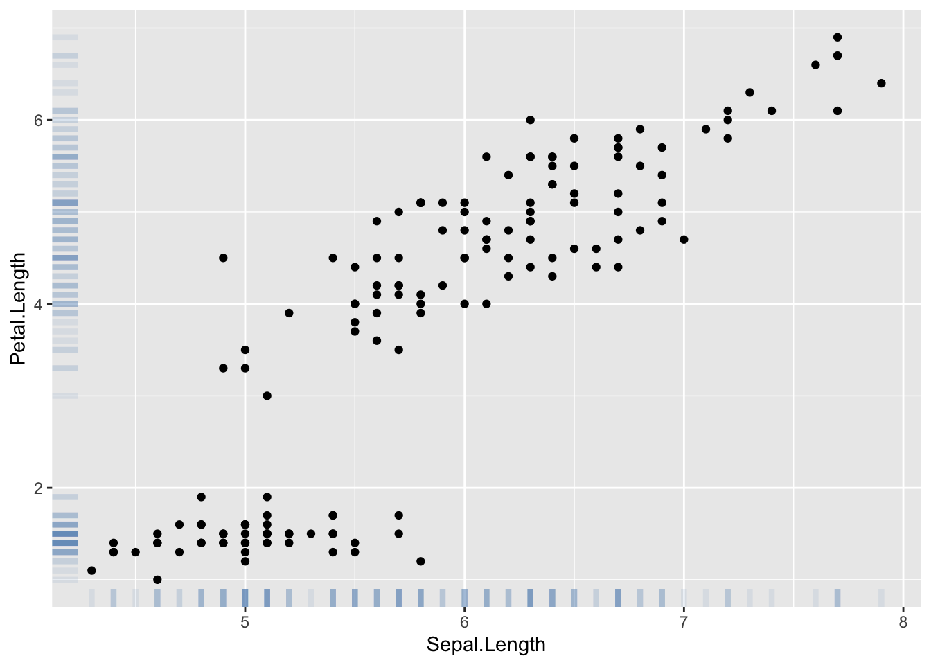在X轴和Y轴上添加geom_rug图,可以显示数据的分布情况。