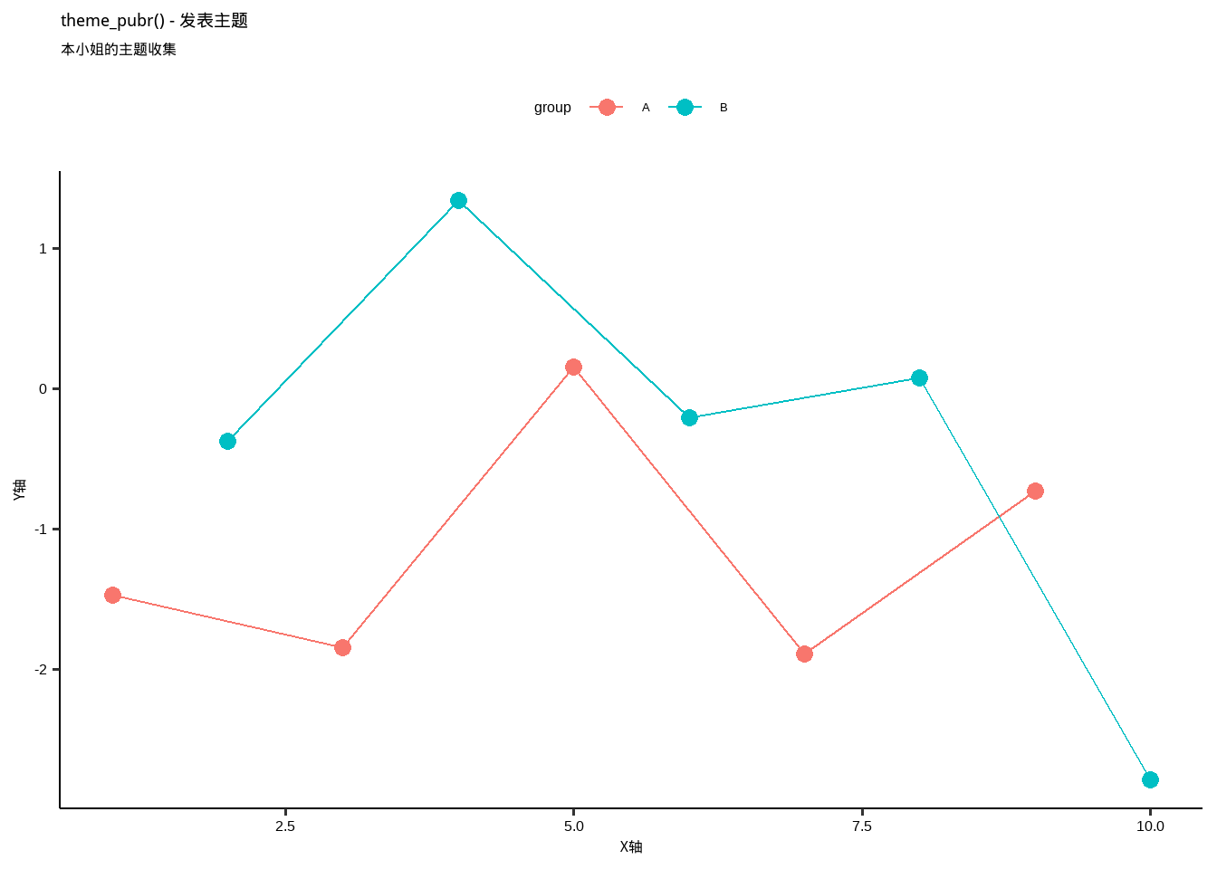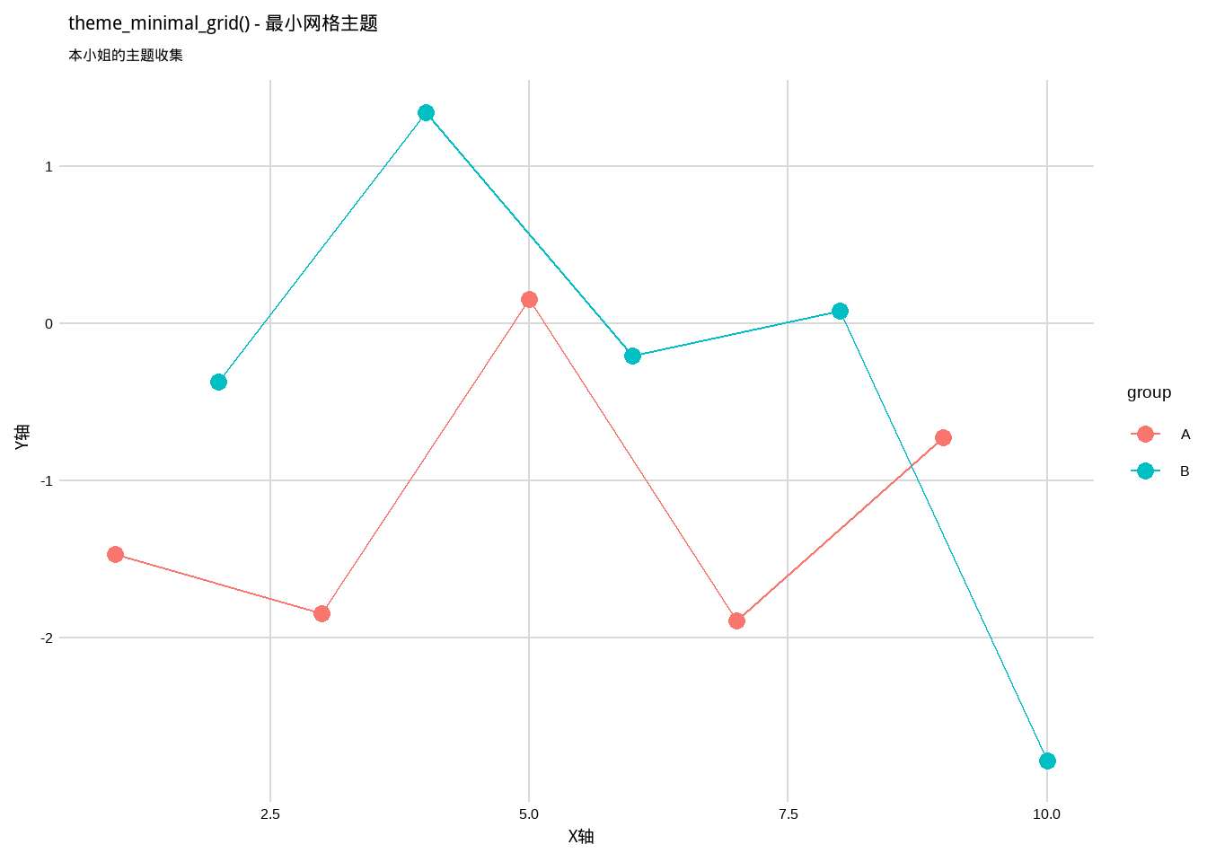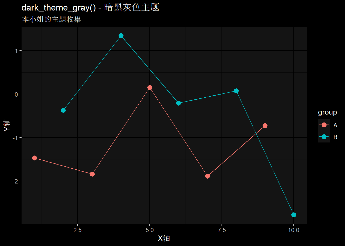 labs(title = "各种主题展示", subtitle = "本小姐的主题收集", x = "X轴", y = "Y轴")