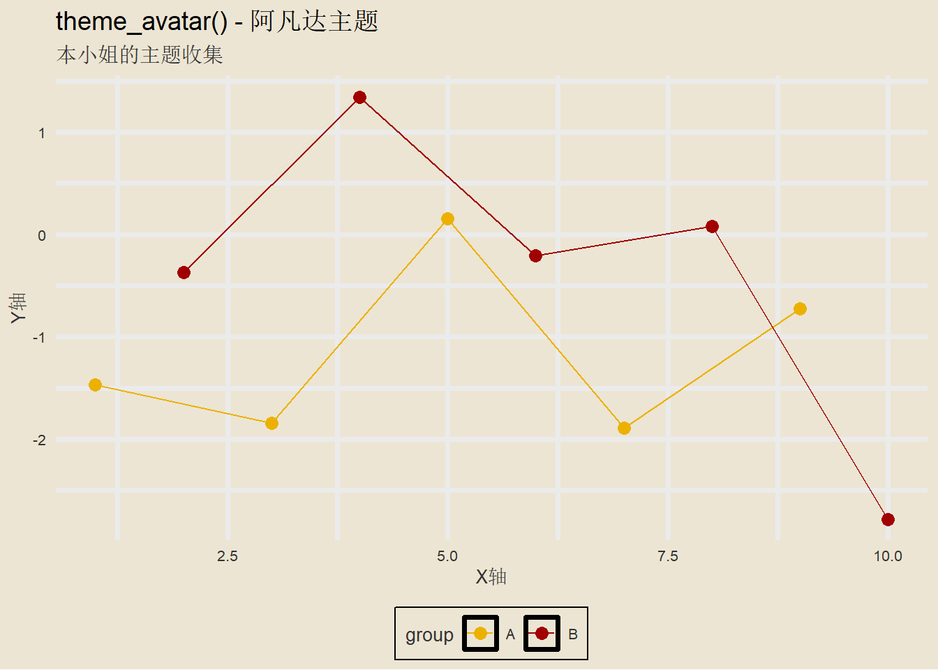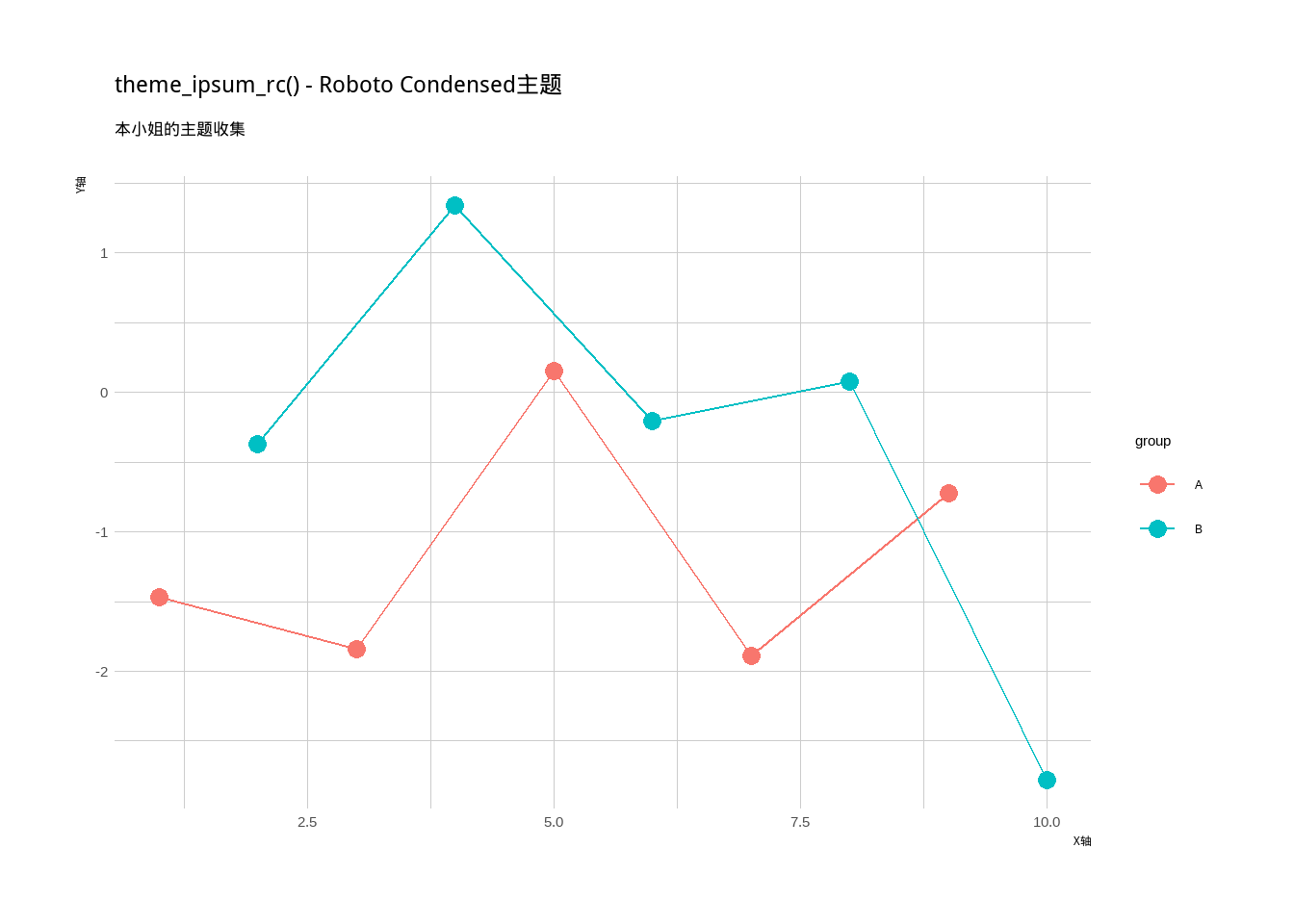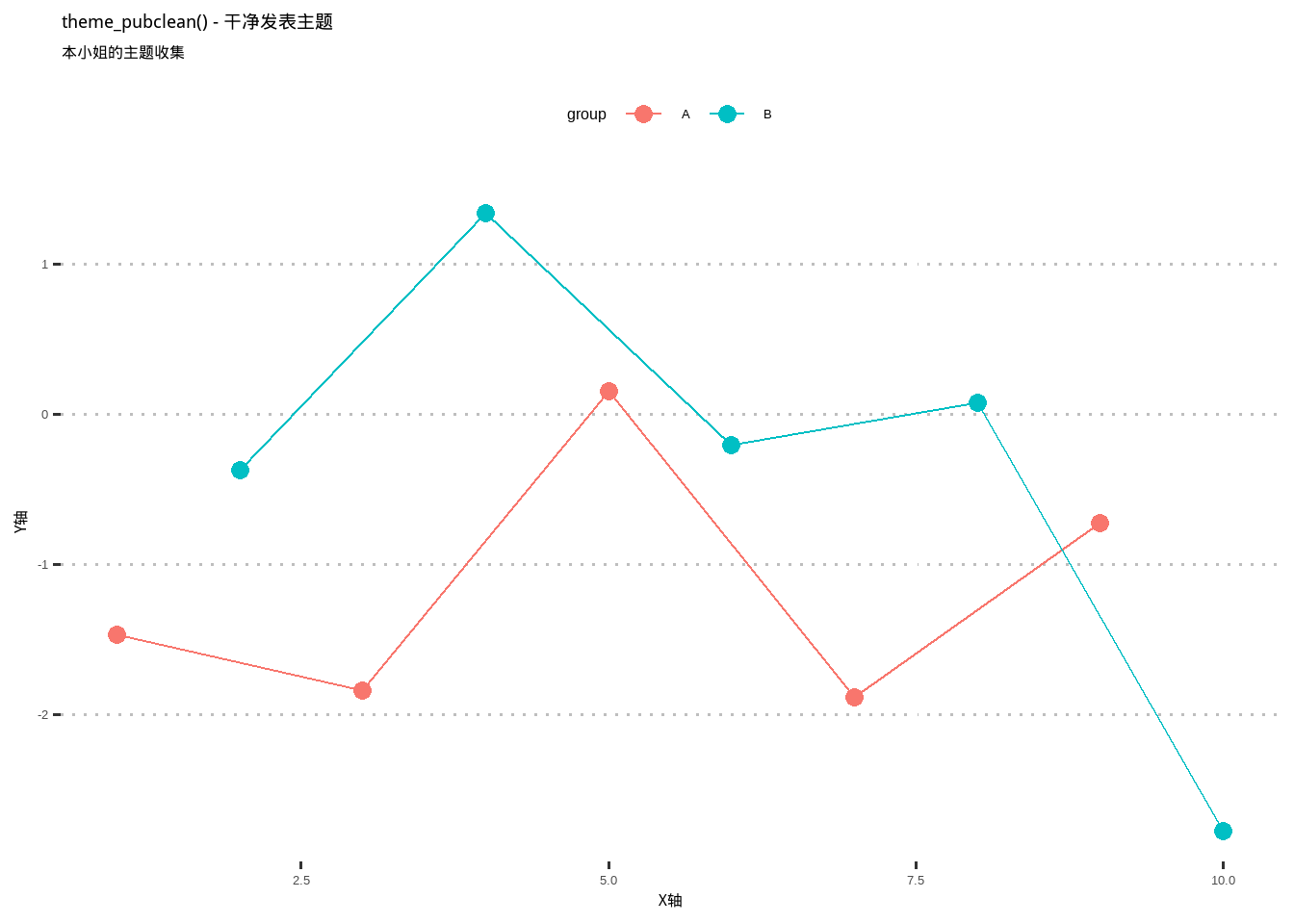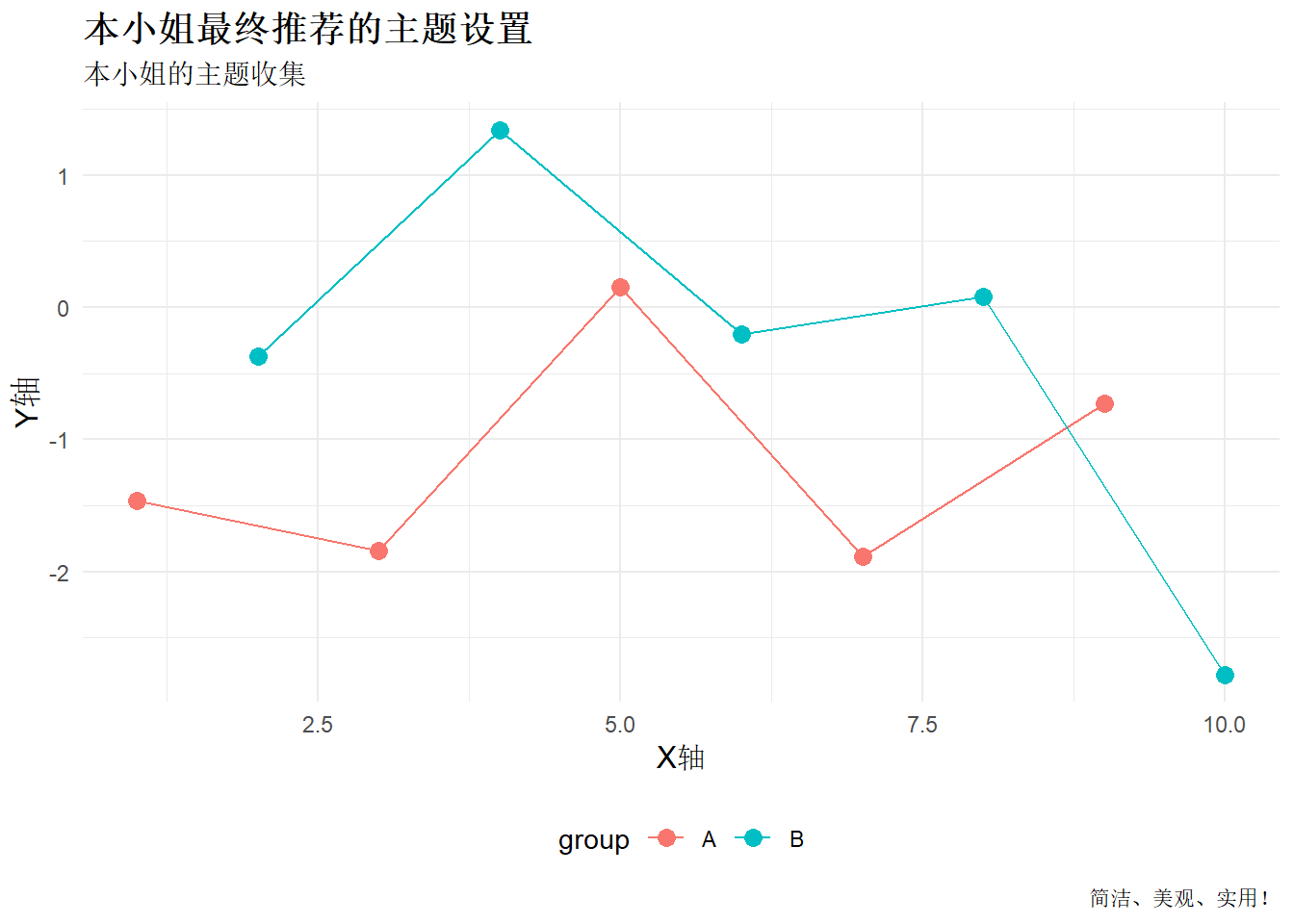 labs(title = "各种主题展示", subtitle = "本小姐的主题收集", x = "X轴", y = "Y轴")