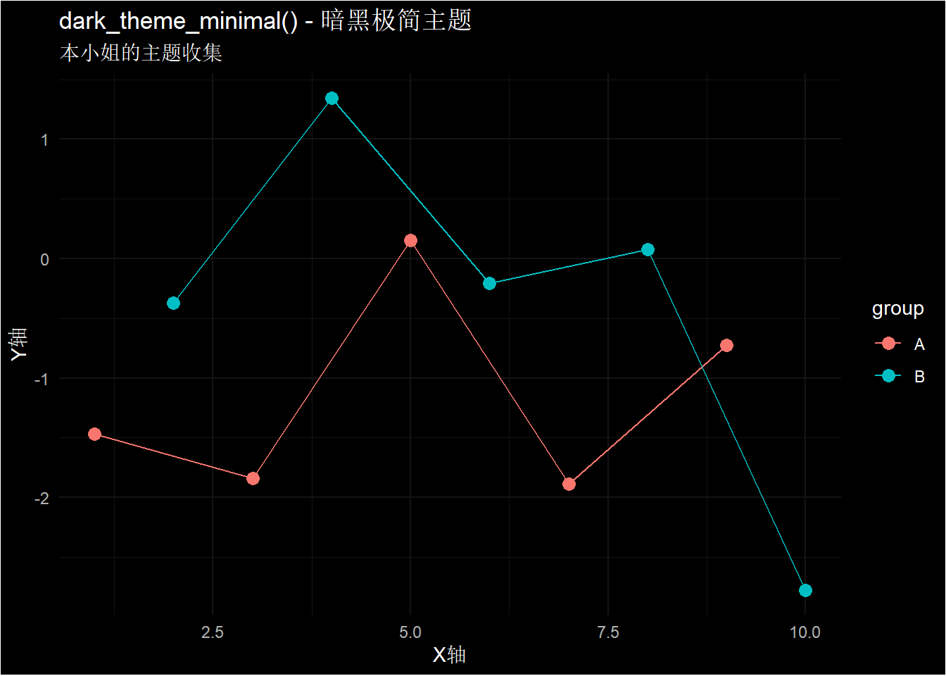 labs(title = "dark_theme_minimal() - 暗黑极简主题")