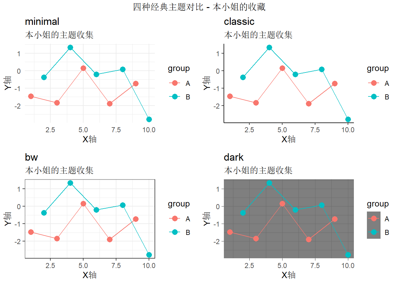ggplot2 自带了好几个经典主题,本小姐先给你们展示一下!