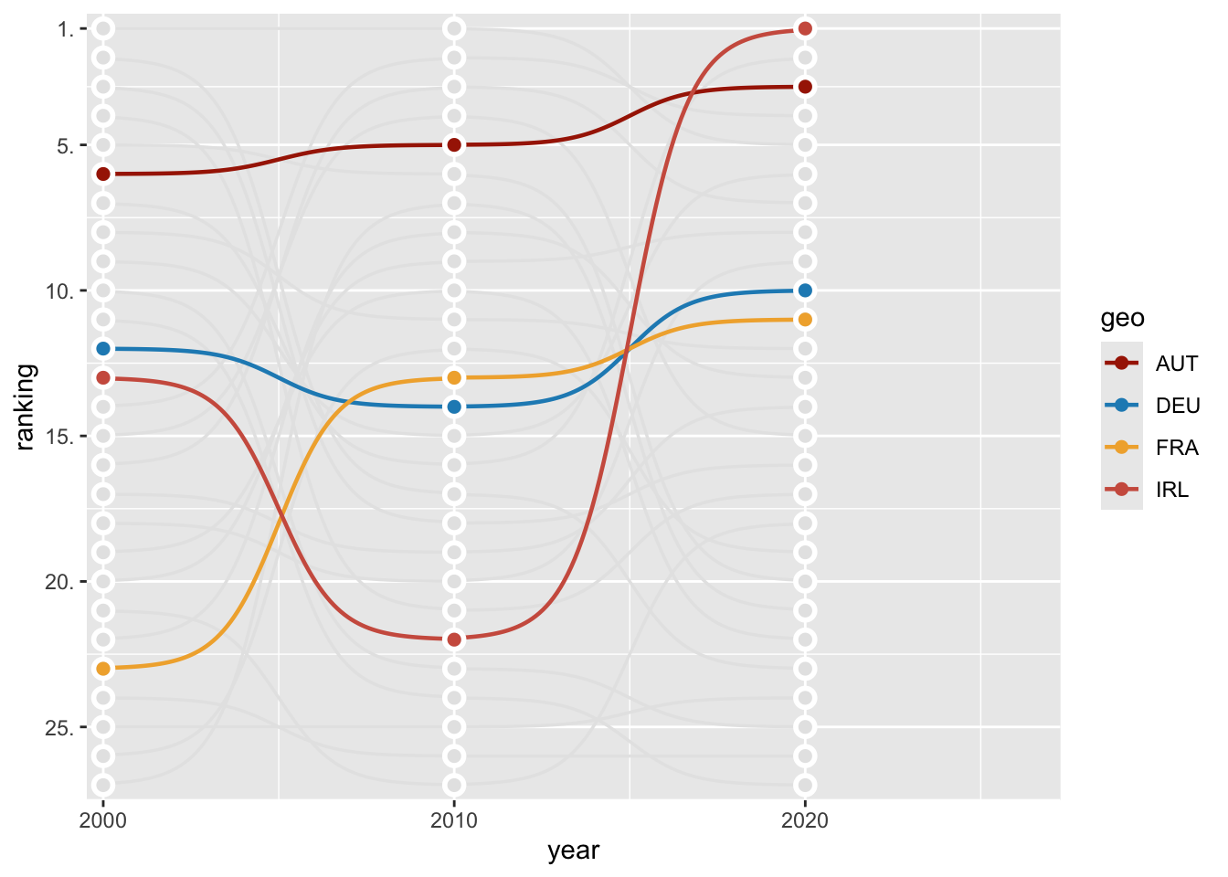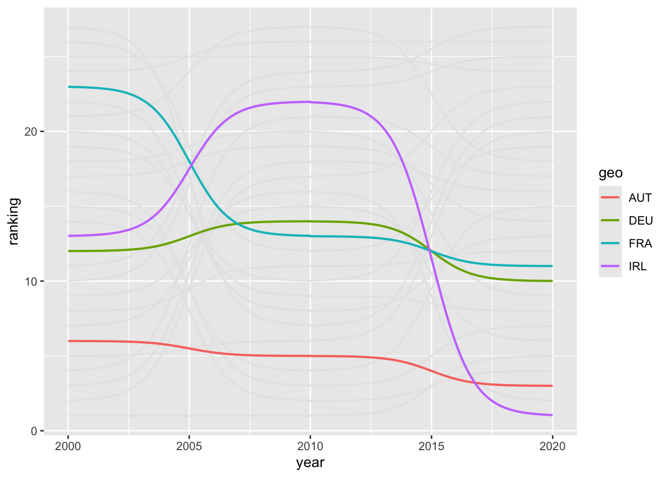 ggplot(aes(x = year, y = ranking, group = geo)) +