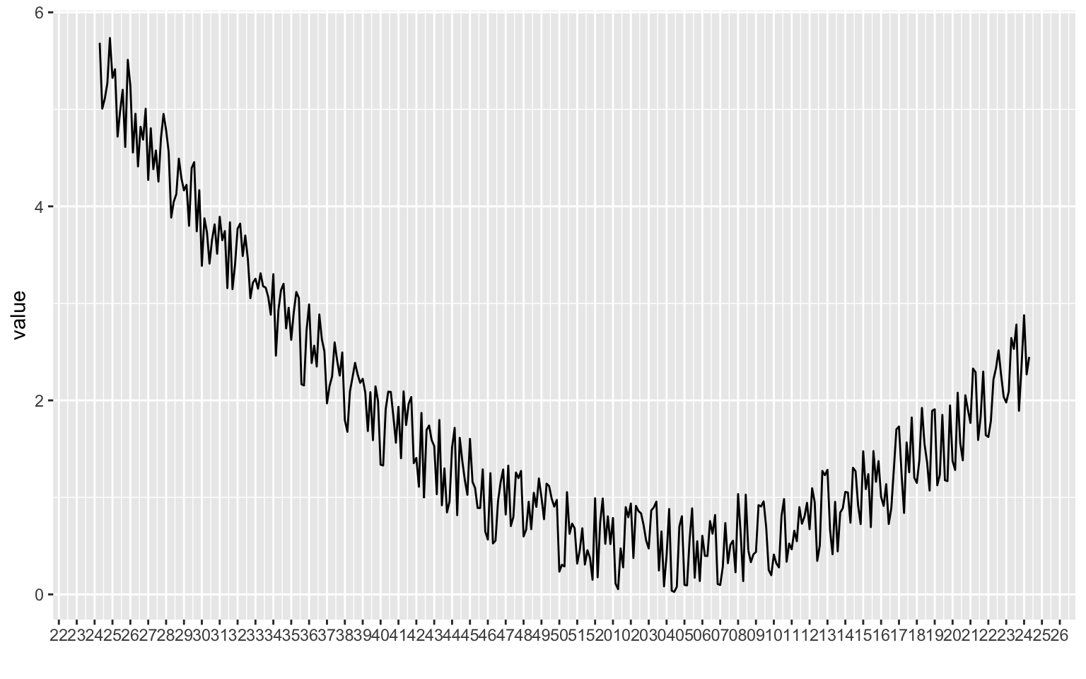 p <- ggplot(data, aes(x = day, y = value)) +