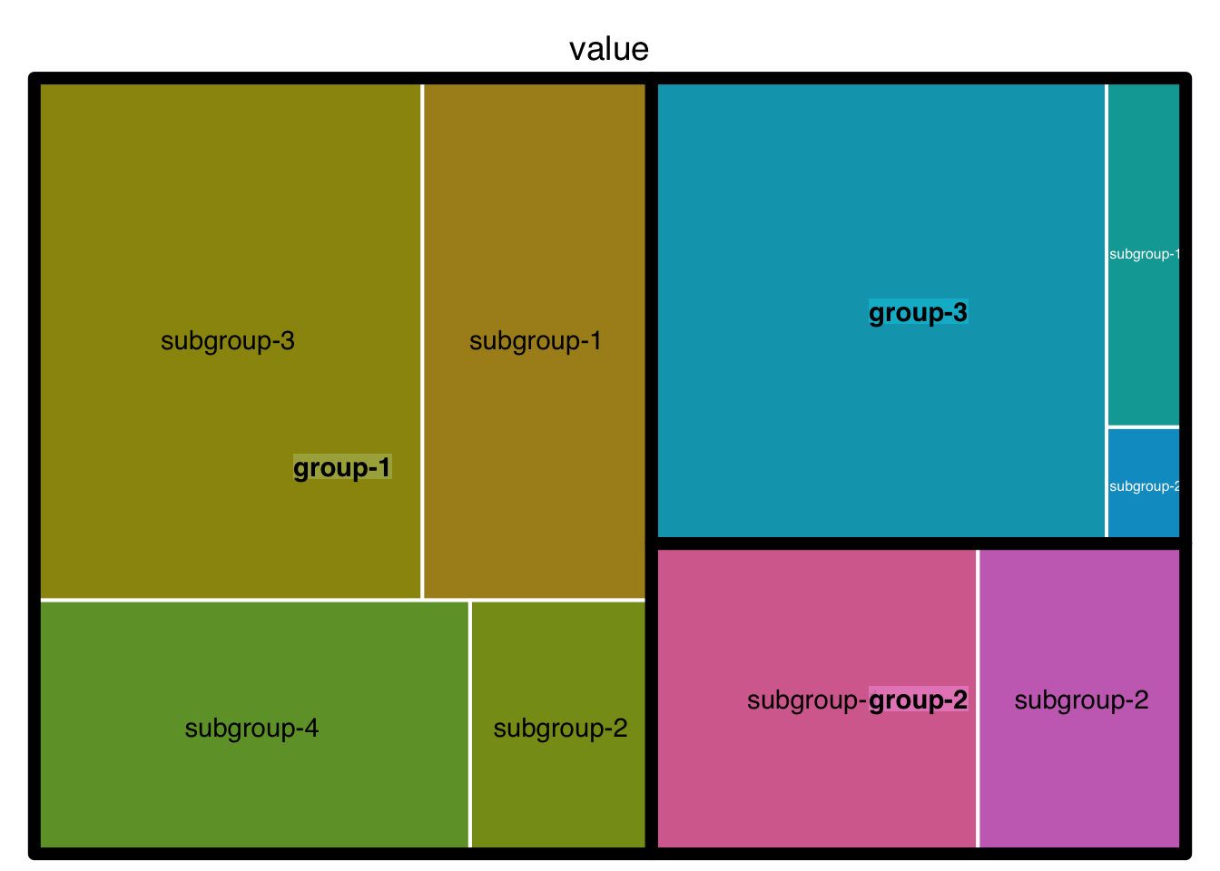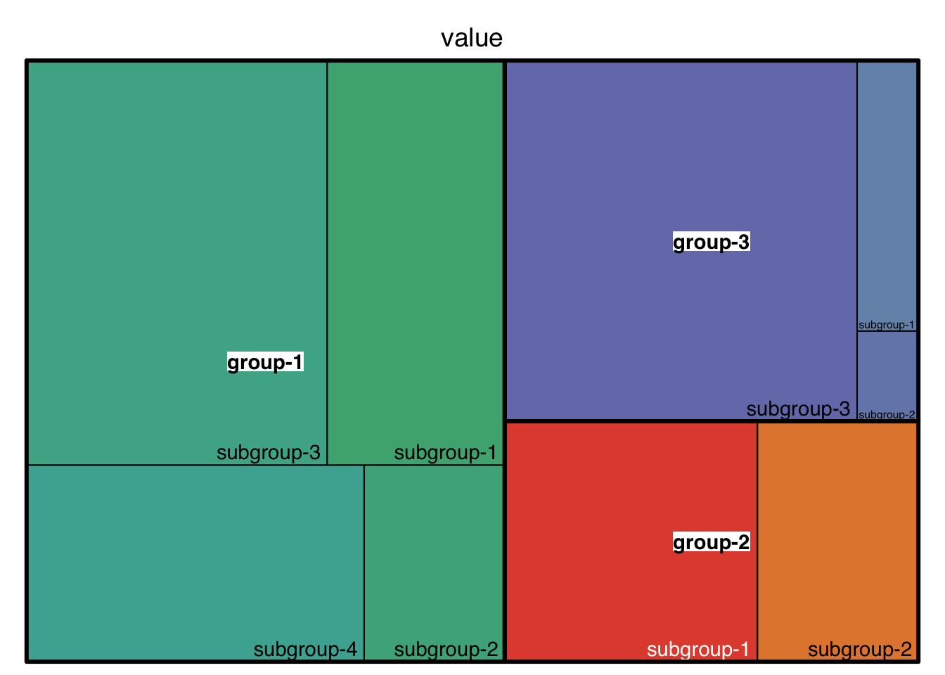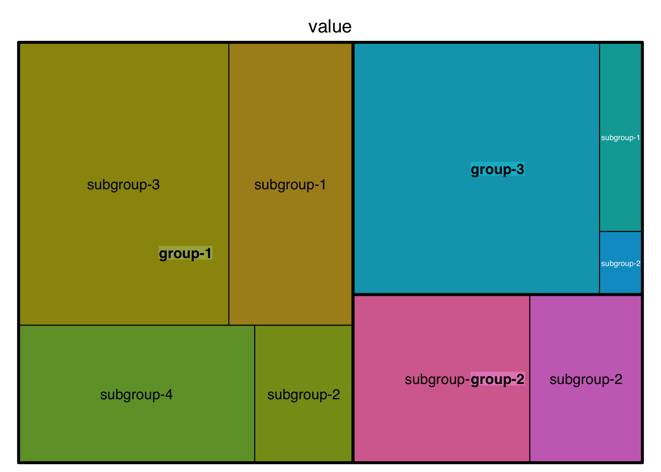 treemap(data, index = c("group", "subgroup"), vSize = "value", type = "index")