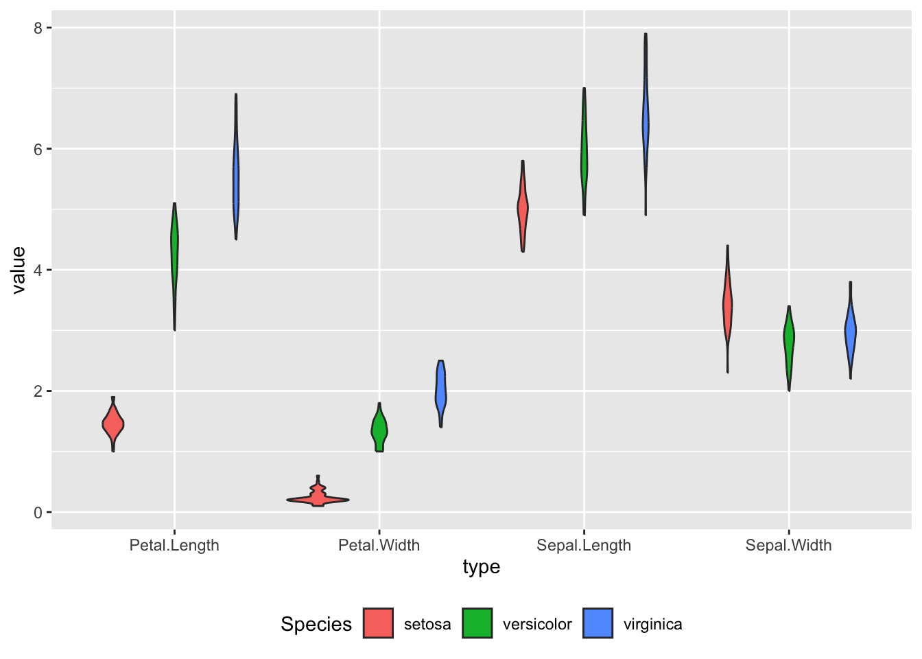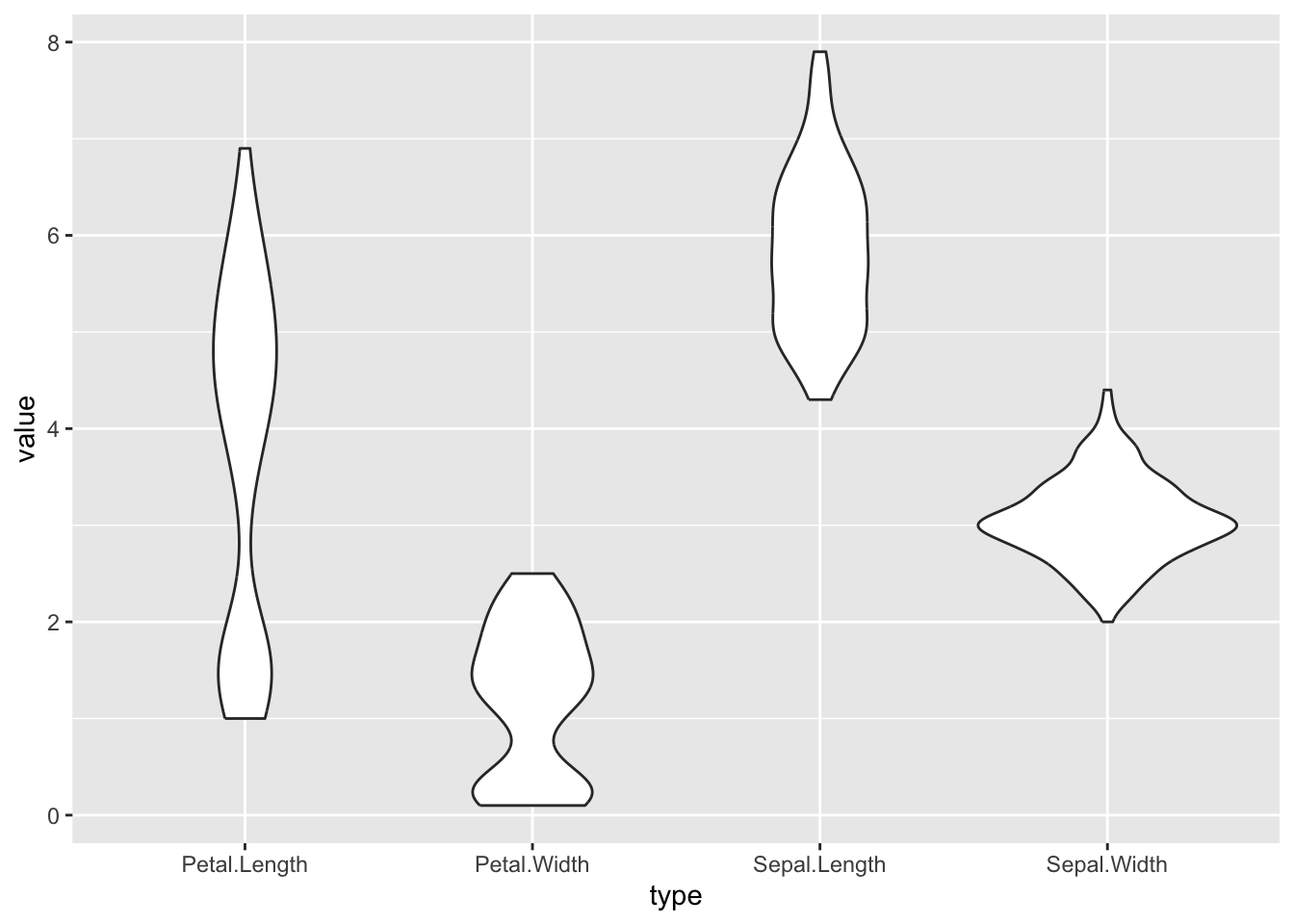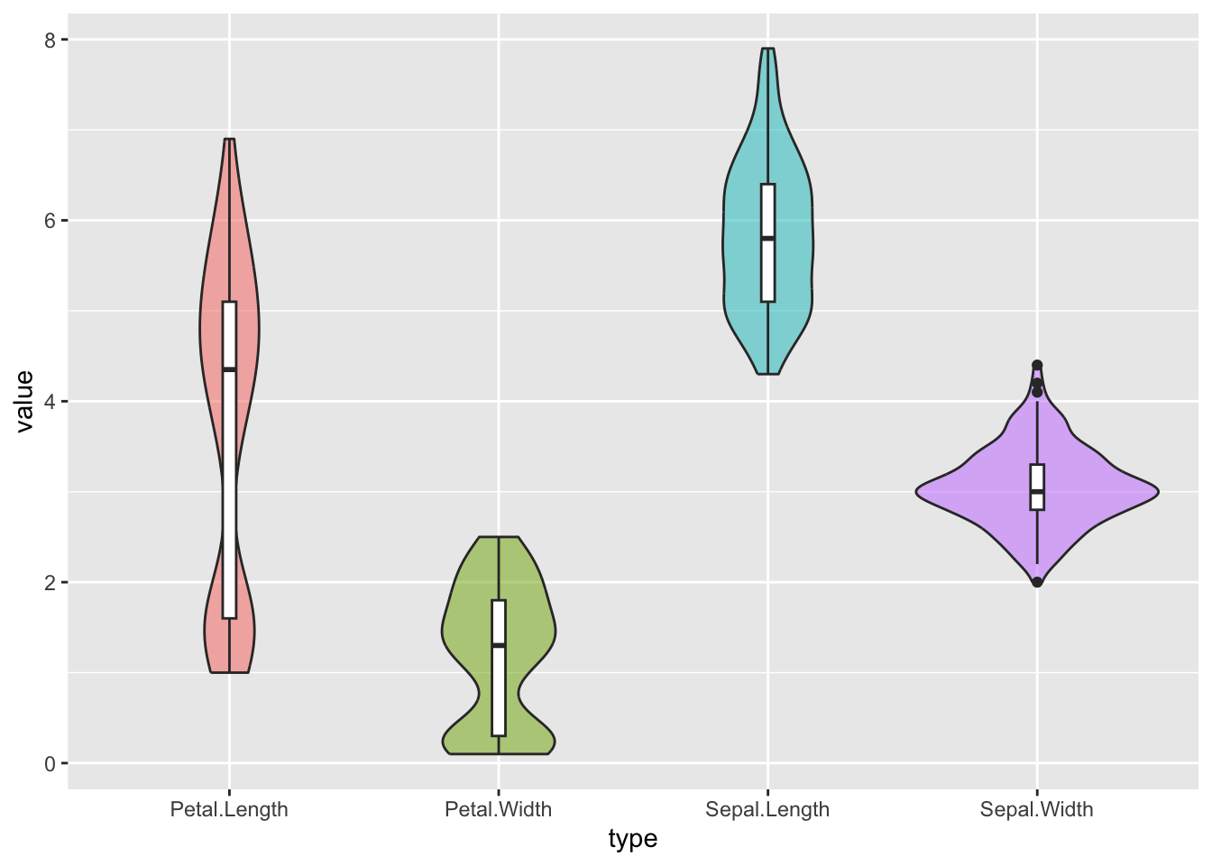 ggplot(iris_long, aes(x = type, y = value)) +